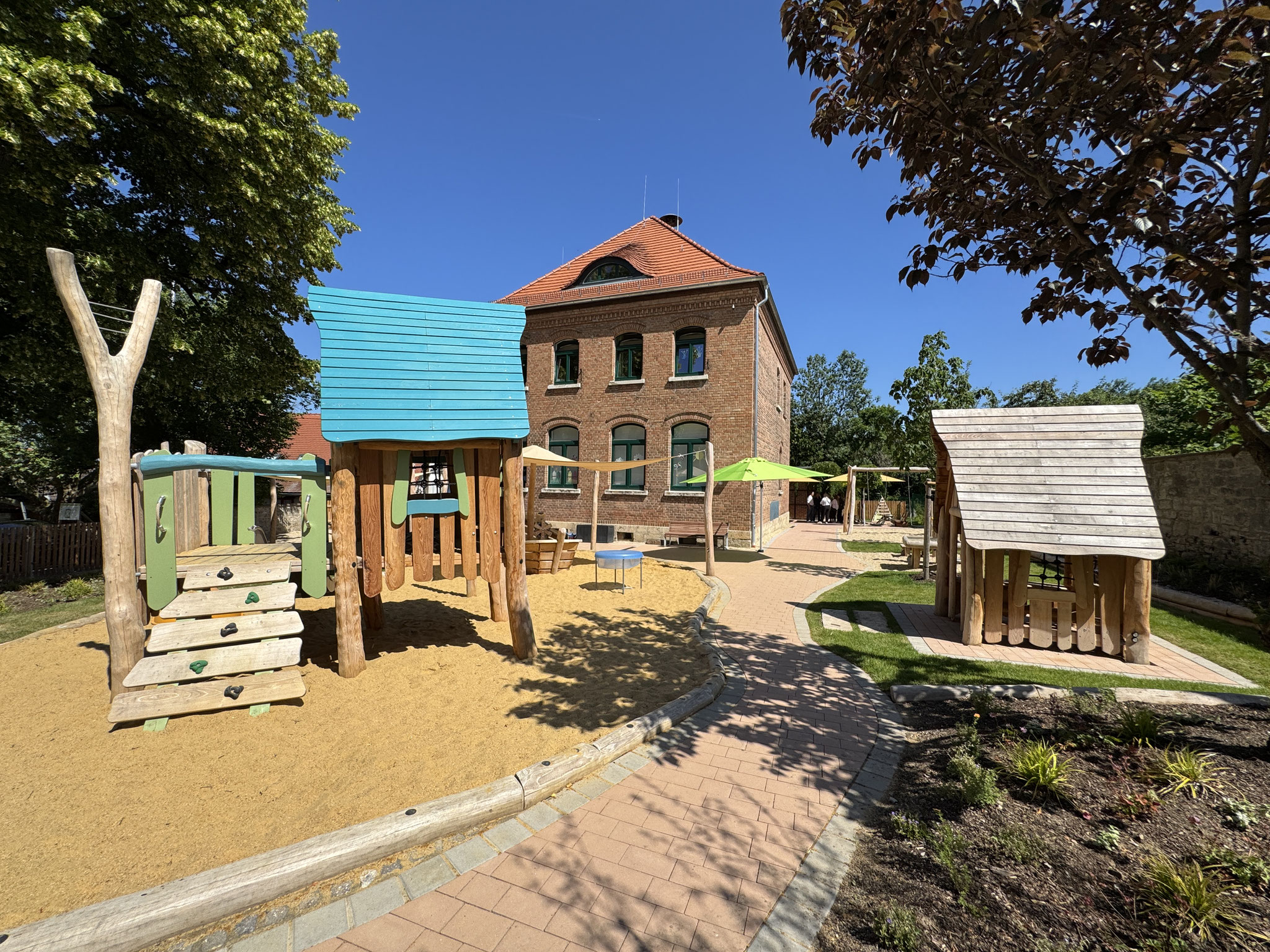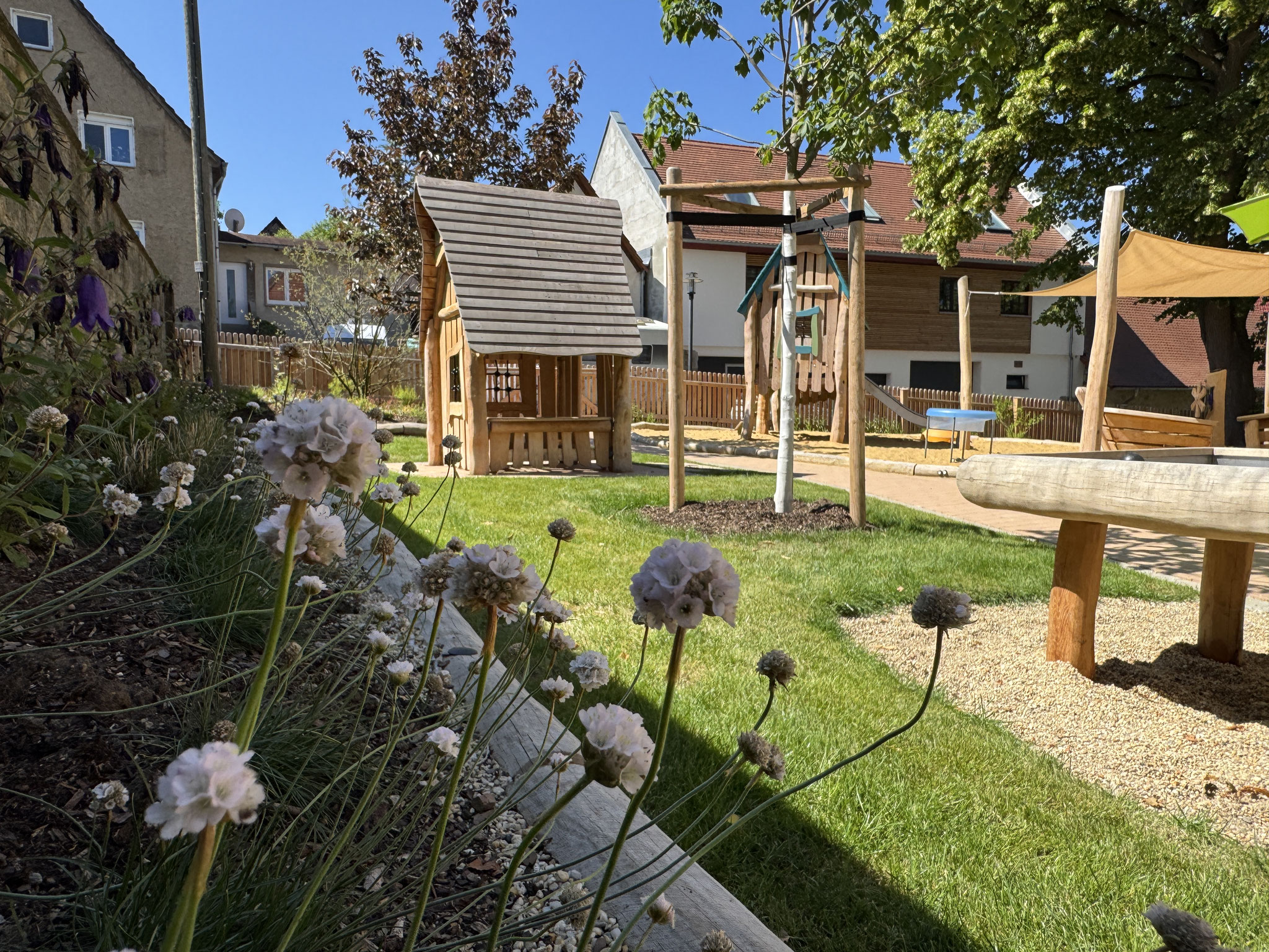 Thüringen en miniature: Dieser Schaugarten ist inspiriert von den typischen Landschaftsstrukturen des Freistaats. Sie werden aufgegriffen und im Kleinen neu interpretiert - Wälder, Felsen, Flüsse und Wiesen. Der Weg schlängelt sich wie ein mäandernder Flusslauf durch die Landschaft, Wasser ergießt sich aus Felsen in diesen "Fluss". Gesäumt wird er von Kalkmagerrasen auf der einen und einer bunten Streuobstwiese auf der anderen Seite. Ein artenreicher Mischwald wächst auf den Bergkuppen über den Kalksteinfelsen.